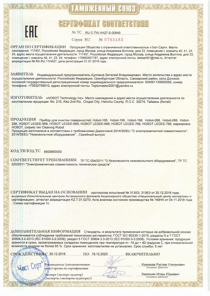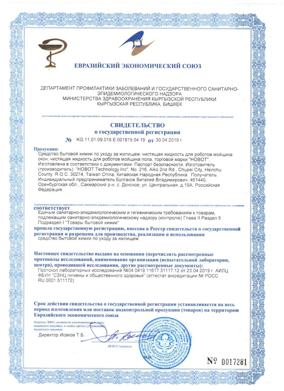 Сертификат моющие средства HOBOT