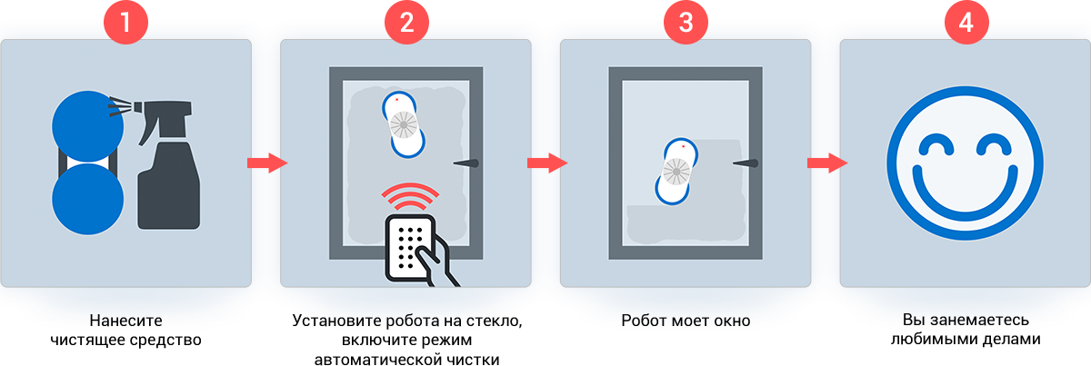 Вертикальные поверхности робот-уборщик всегда начинается сверху, куда поднимается сам, после нажатия на пульте “Запуск программы вверх” и постепенно спускается сверху вниз. Он самостоятельно определит площадь окна, тщательно выполнит свою задачу и вернется в исходное положение. Управление роботом очень простое и удобное.